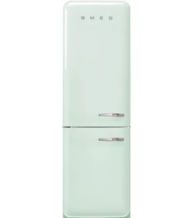 Frigorífico combi Smeg FAB32LPG6 estilo años 50 en color verde agua pastel. Con tecnología No Frost, su capacidad total es de 331 litros. Es ultra silencioso, solo emite 35 dB, y tiene una clasificación de eficiencia energética C. Incluye cajón para frutas y verduras, dos baldas ajustables y un botellero en el interior de la puerta.
