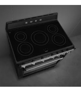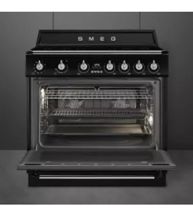 La cocina Smeg TR90IMBL, de 90 cm de ancho, pertenece a la clásica serie Victoria y cuenta con una moderna placa de inducción multizona. Su diseño en color negro se combina con un gran horno eléctrico multifunción. Este modelo es ideal para quienes buscan la estética tradicional de Smeg pero prefieren la precisión y limpieza de la tecnología de inducción.