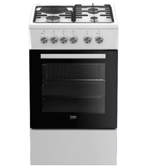 Cocina mixta Beko FSS53011DW de 50x85x60 cm. Dispone de 4 fuegos (gas/eléctrico) y un horno eléctrico de 60 L con convección natural. Incluye seguridad por termopar que corta el gas si la llama se apaga accidentalmente. Ideal para una cocción versátil y segura en cualquier hogar. Dimensiones compactas y funcionalidad completa.