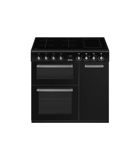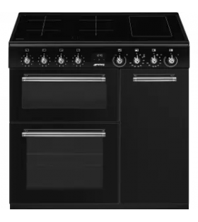 Cocina Smeg CX93IMBL de 90 cm La Smeg CX93IMBL es una cocina de libre instalación de 90 cm de la estética Classica en color Negro. Está equipada con una moderna placa de inducción de 4 zonas con función Booster y opción Bridge (para crear una zona grande). Ofrece una capacidad total de hasta 158 litros repartida en tres hornos eléctricos (principal, auxiliar y grill), ideales para cocinar varios platos simultáneamente. Cuenta con el esmalte Ever Clean de fácil limpieza y múltiples funciones, incluyendo AirFry y Pizza Stone.