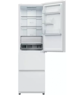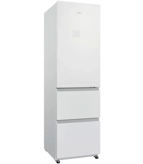 Frigorífico Combi Haier HTR3518ENMW de 303L (196L nevera/107L congelador). Diseño compacto (185x54,5 cm) y 3 puertas. Tecnología Total No Frost con sistema Air Surround y motor Inverter silencioso (35 dB). Incluye cajón My Zone Pro y Direct Access en el congelador. Conectividad App hOn. Eficiencia Clase E. Color Blanco.