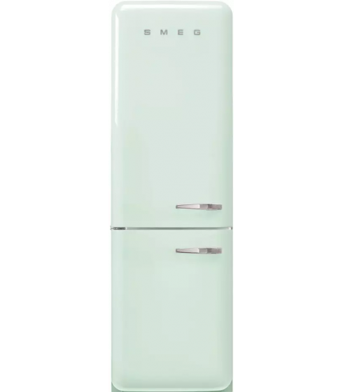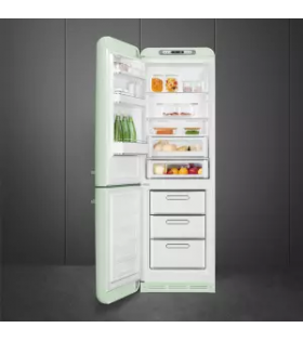 Frigorífico combi Smeg FAB32LPG6 estilo años 50 en color verde agua pastel. Con tecnología No Frost, su capacidad total es de 331 litros. Es ultra silencioso, solo emite 35 dB, y tiene una clasificación de eficiencia energética C. Incluye cajón para frutas y verduras, dos baldas ajustables y un botellero en el interior de la puerta.