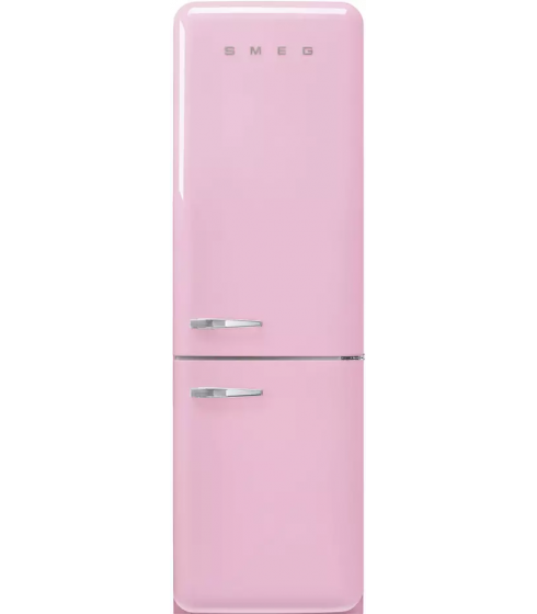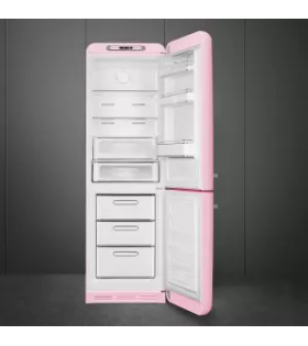 Frigorífico combi Smeg FAB32RPK6 estilo años 50 en color rosa pastel. Con tecnología No Frost, su capacidad total es de 331 litros (234L refrigerador, 97L congelador). Es ultra silencioso con 35 dB y cuenta con eficiencia energética C.