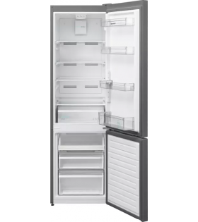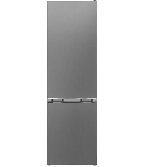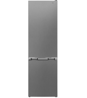 Frigorífico Combi Sharp SJFBA05DTXLE de 270L (195L nevera/75L congelador) con 180 cm de altura y 54 cm de ancho. Ofrece tecnología No Frost (frío ventilado) que evita la escarcha. Incluye función Adapti Freezer (hasta -15°C), iluminación LED, bajo nivel de ruido (40 dB) y eficiencia energética Clase E. Acabado Silver (plata).