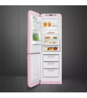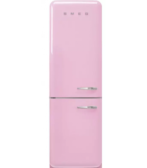 Smeg FAB32LPK6: Frigorífico combi de libre instalación con el icónico diseño de los años 50 en un atrevido color Rosa (Pink). Cuenta con tecnología Total No Frost para una conservación óptima sin escarcha y sistema MultiFlow. Con 197 cm de altura, ofrece una capacidad total de 331 litros y un compartimento Extra-Fresh para carnes y pescados. Su eficiencia energética es Clase C. Perfecto para añadir un toque de color y estilo vintage a tu cocina.