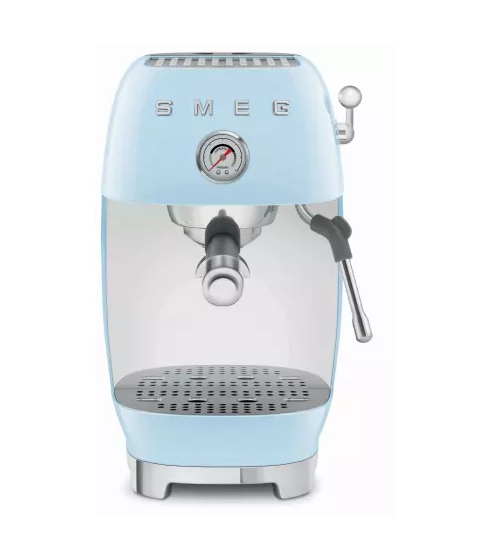 La cafetera espresso Smeg ECF03PBEU, en azul pastel, combina el icónico estilo retro de los años 50 con tecnología avanzada. Prepara deliciosos cafés con 15 bares de presión, calentamiento rápido (Thermoblock) y una lanza de vapor para espumar leche. Es compatible con café molido y monodosis ESE, ideal para cualquier amante del café.