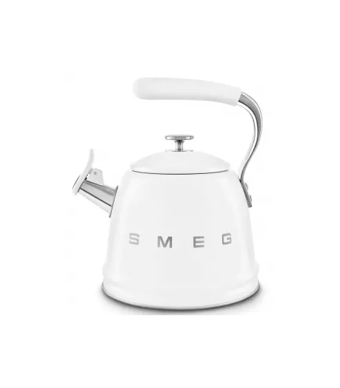 El Hervidor Silbante Smeg WKF01WH en un impoluto color Blanco, de estilo 50's Style, es sinónimo de elegancia y atemporalidad en tu cocina. Fabricado en robusto acero inoxidable y con una capacidad de 2,3 litros, es ideal para cualquier necesidad de ebullición. Es apto para todas las fuentes de calor, incluyendo las placas de inducción, ofreciendo máxima versatilidad. Su mango ergonómico revestido de silicona garantiza un manejo seguro, mientras que su característico silbato emite una señal sonora clara y nostálgica al alcanzar el punto de ebullición