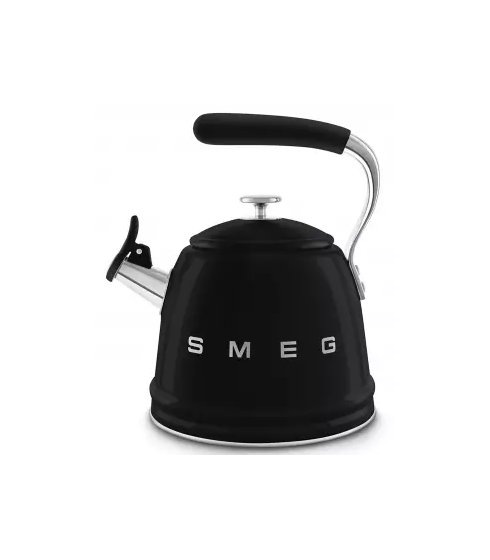 El Hervidor Silbante Smeg WKF01BL en elegante Negro (Black) es un icono de diseño de la línea 50's Style que aporta un toque de sobriedad a tu cocina. Fabricado en acero inoxidable de alta calidad, ofrece una capacidad de 2,3 litros ideal para grandes infusiones o café. Es compatible con todas las fuentes de calor, incluyendo la fundamental inducción, lo que subraya su funcionalidad moderna. Su asa con revestimiento de silicona facilita un agarre seguro, y su inconfundible silbato emite el aviso sonoro cuando el agua alcanza la ebullición.