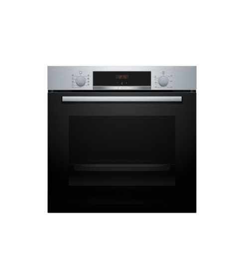 Horno Bosch HBA514ES3 Serie 4 (71L, Clase A+) en acero inoxidable con 7 funciones. Destaca la función 3D Hotair para cocción perfecta en 3 alturas, y el Asistente de limpieza con agua (hidrolítica) para un mantenimiento fácil. Incluye guías telescópicas en 1 nivel y mandos ocultables para un diseño limpio y seguro. Dispone de Display LED rojo y función Sprint de precalentamiento rápido.