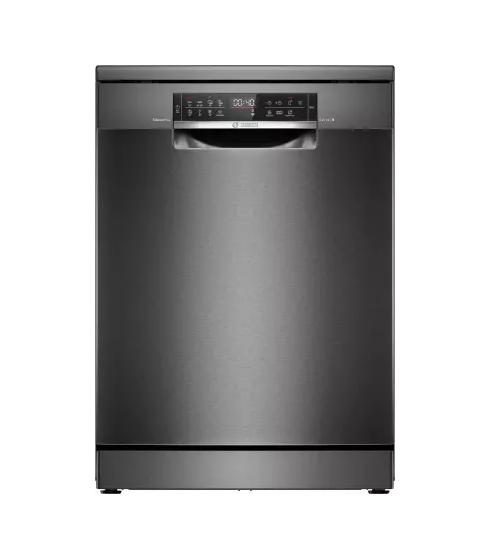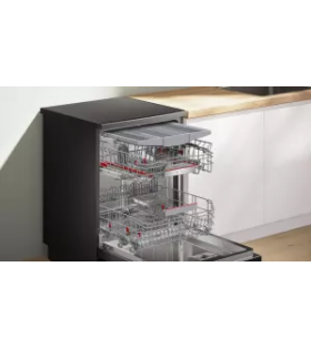 Lavavajillas Bosch Serie 6 (SMS6ECC12E) de libre instalación, 60 cm y 14 servicios, en color acero negro antihuellas. Es de máxima eficiencia (Clase A) y muy silencioso (42 dB). Incluye secado EfficientDry con apertura de puerta, función SpeedPerfect Plus, Home Connect (Wi-Fi) y motor EcoSilence. Cestas MaxFlex, 3ª bandeja VarioDrawer y sistema AquaStop.