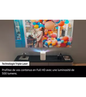 Proyector Samsung The Premiere 5 (SP-LPF5DSAXXXE) Full HD con tecnología de triple láser y tiro ultra corto. Proyecta una imagen de hasta 100 pulgadas a muy poca distancia de la pared. Disfruta de una experiencia de cine en casa premium con resolución Full HD (1920x1080), Smart TV Tizen, Dolby Atmos y funciones avanzadas como HDR10+ y Vision Booster. Ofrece conectividad completa (Wi-Fi 5, Bluetooth 5.2) y un elegante diseño Lifestyle.