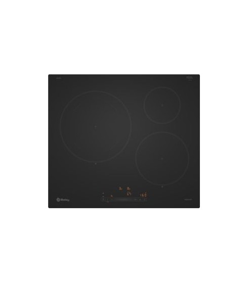 Placa de Inducción Balay 3EB965MH de 60 cm con diseño en cristal negro mate y sin perfiles. Ofrece 3 zonas de cocción, incluyendo una gigante de 28 cm. Incorpora Control de Temperatura del Aceite (11 niveles) y Control Placa-Campana. Dispone de Home Connect (control remoto), 17 niveles de cocción, Función Sprint, Pausa y seguridad para niños. Potencia total: 7.4 kW. Máxima tecnología para una cocina precisa y conectada.